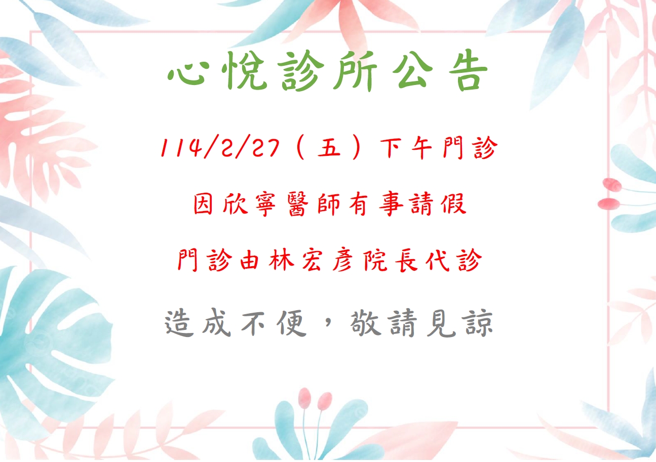 2/27李欣寧醫師因事請假,門診調整